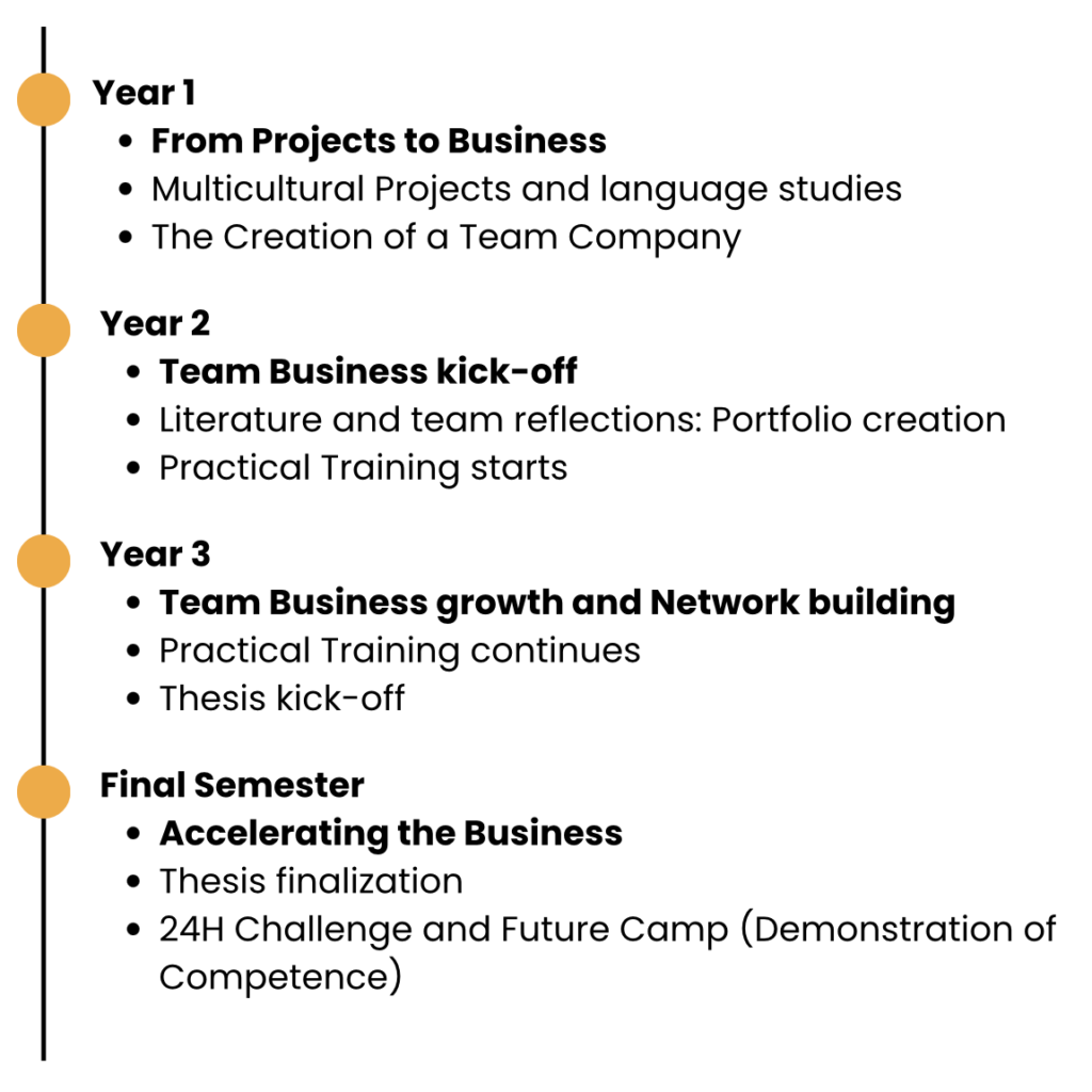 During the second and third years, students focus on developing their company, working on real business challenges. They are encouraged to take initiative, experiment actively, and travel internationally with their team as much as possible.